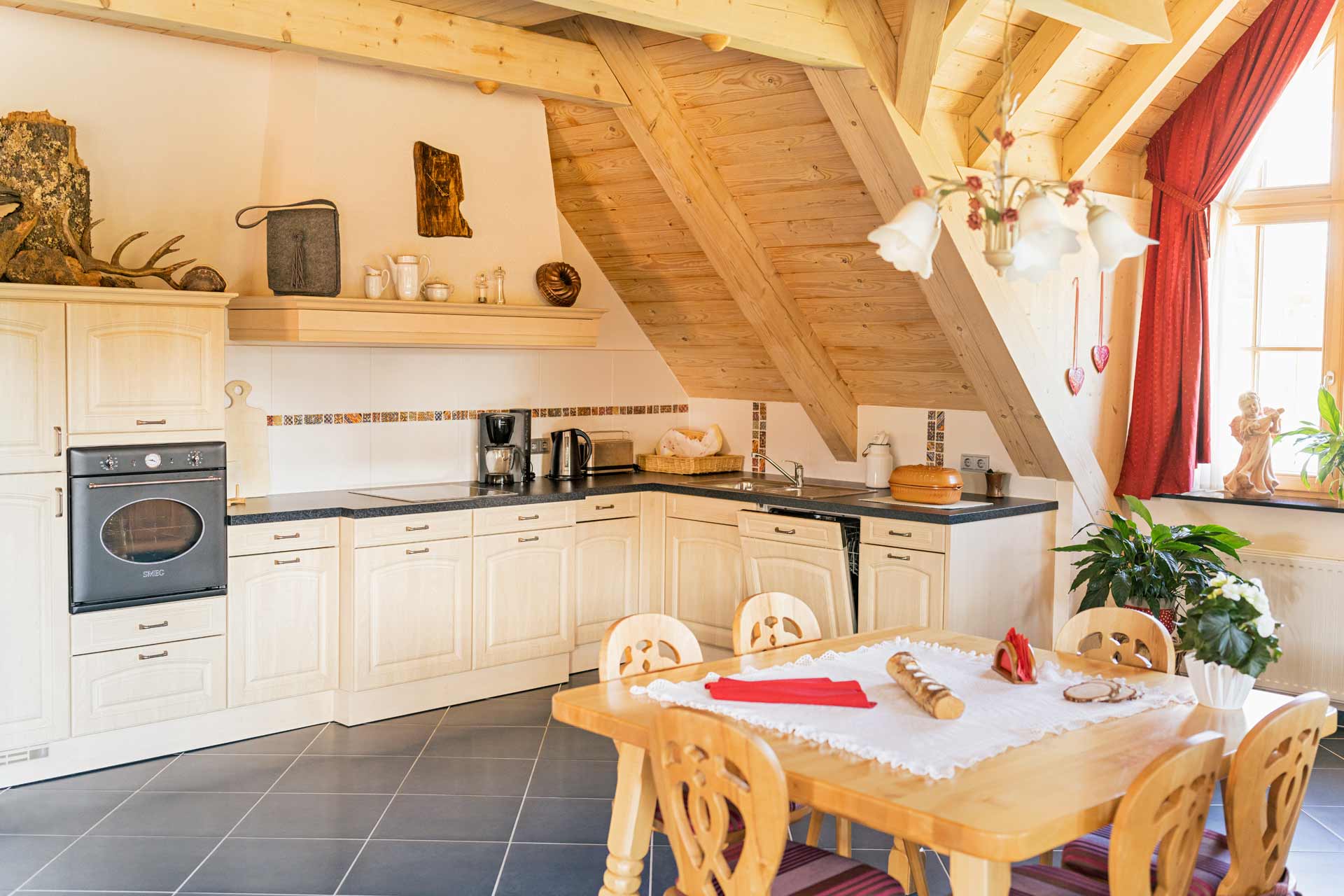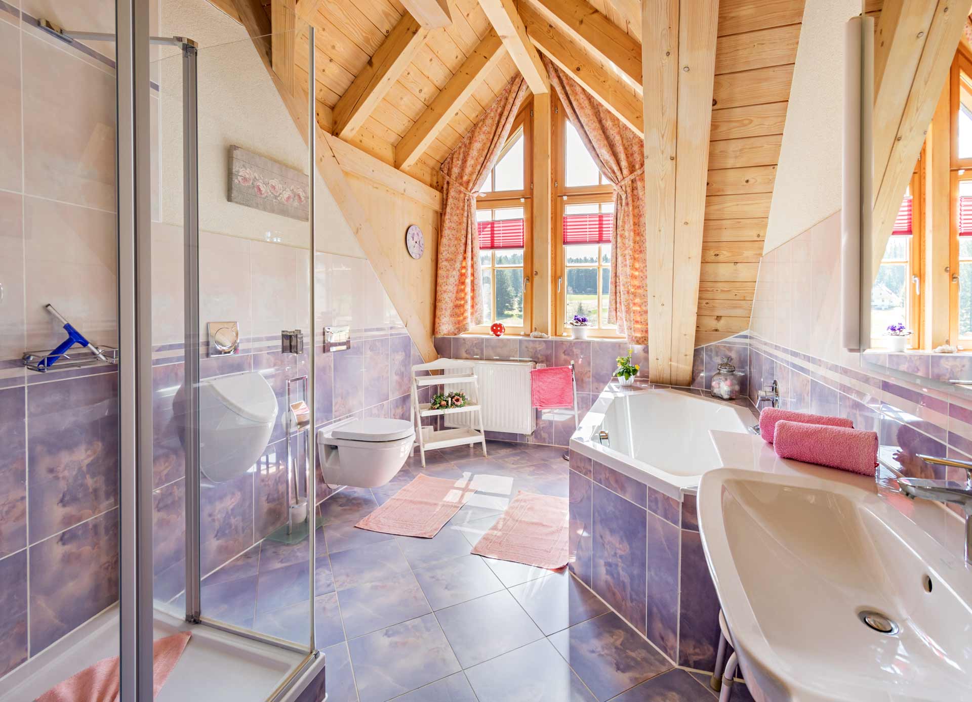 Luxuriös ausgestattet ist diese 150 Quadratmeter große Ferienwohnung im 1. Obergeschoss mit Kachelofen und Blick auf frische Schwarzwaldwiesen. Zwei Schlafzimmer, Toilette, Badezimmer mit Dusche und Badewanne, Wohnzimmer und Essbereich sowie Saunabenutzung, Liegewiese und Grillbereich.